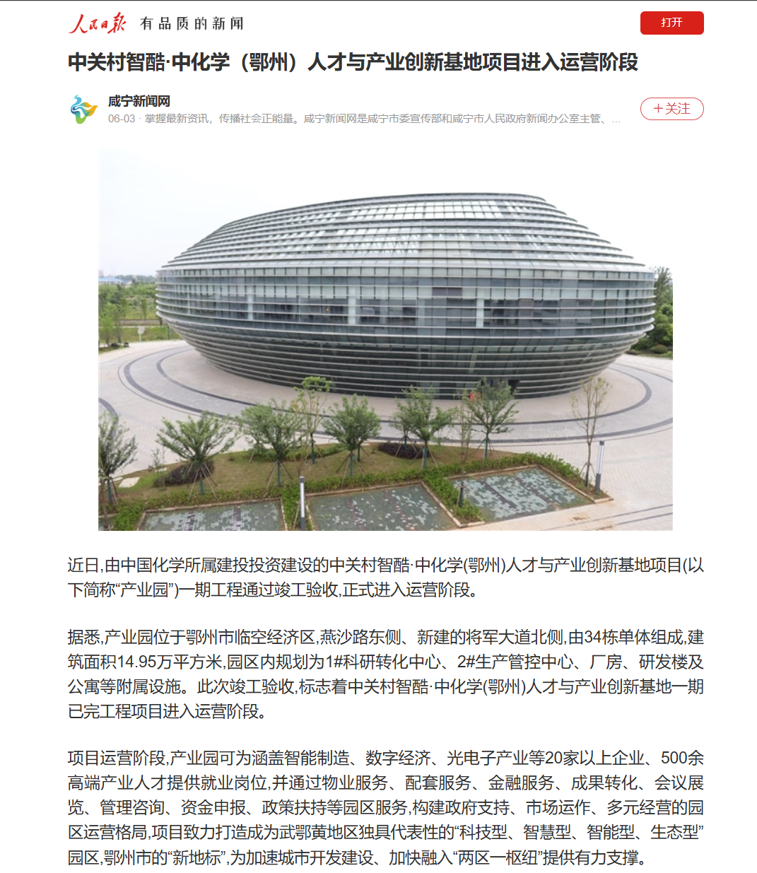 人民日報客戶端——中關(guān)村智酷·中化學(xué)(鄂州)人才與產(chǎn)業(yè)創(chuàng)新基地項目進(jìn)入運營階段